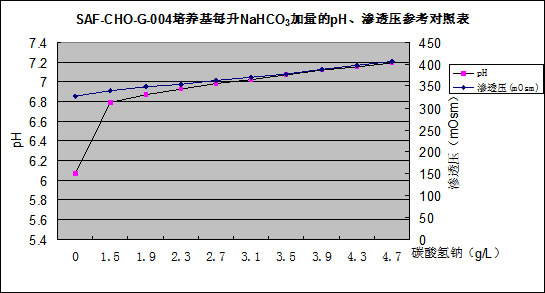 5.3.2 貯存 2℃-8℃冷藏,干燥、密封、避光貯藏?!举A存期限】:暫定一年。 5.3.3配制方法(以1L包裝為例) 1. 1)將一袋粉末培養(yǎng)基全部倒入一容器中,用少量注射用水將袋內(nèi)殘留培養(yǎng)基洗下,并入容器,加注射用水(水溫20℃-30℃)到950毫升,輕微攪拌溶解; 2. 2)加入1.9克碳酸氫鈉; 3. 3)輕微攪拌溶解,加注射用水**1升; 4. 4)如有必要,用1mol / L 氫氧化鈉溶液或鹽酸溶液調(diào)pH**所需值; 5. 5)用0.2μm濾膜正壓過濾除菌; 6. 6)溶液應在2℃-8℃下避光保存。 5.3.4 SAF-CHO-G-004培養(yǎng)基不同NaHCO3加量的pH、滲透壓參考對照表