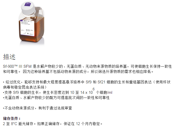 Sf900II含有表面活性劑(剪切力保護(hù)劑(保護(hù)細(xì)胞在轉(zhuǎn)瓶中培養(yǎng)時(shí)不會受到剪切力傷害))